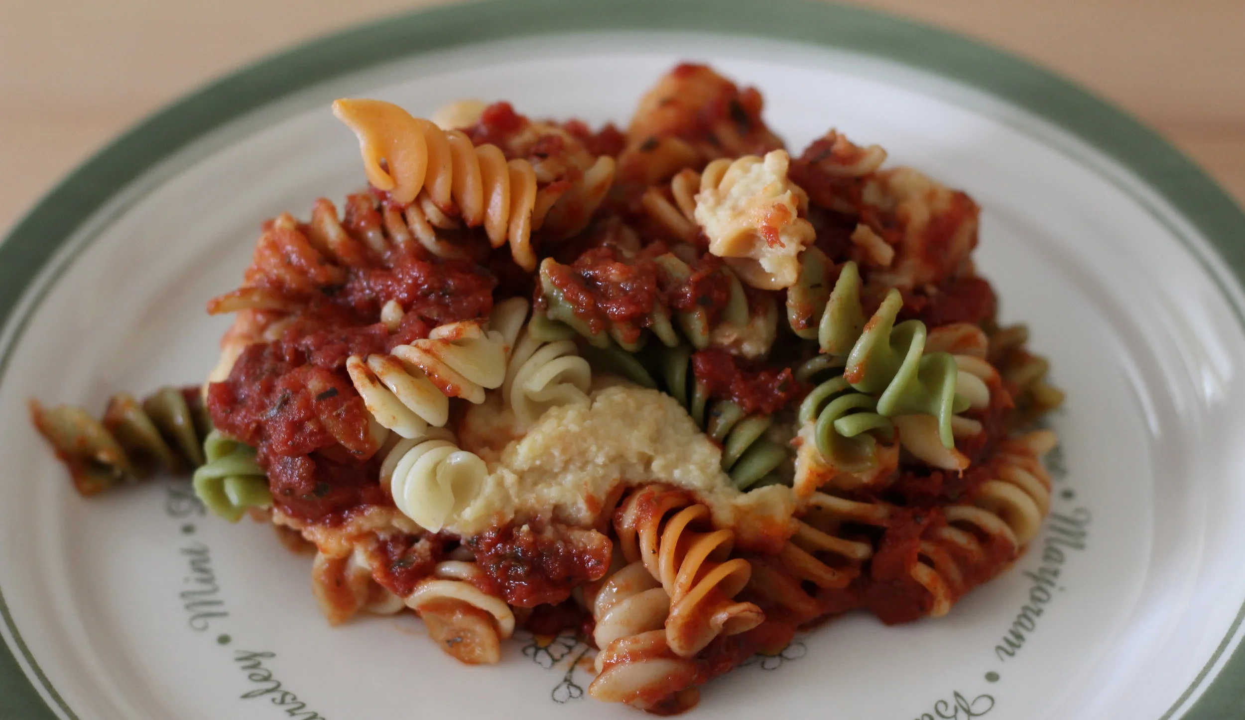 While this dish doesn't have the full on cheesy, salty goodness of mozzarella and Parmesan, it actually really does hit the spot for pasta, marinara sauce, and the fluffy, mouth-feel of ricotta cheese.