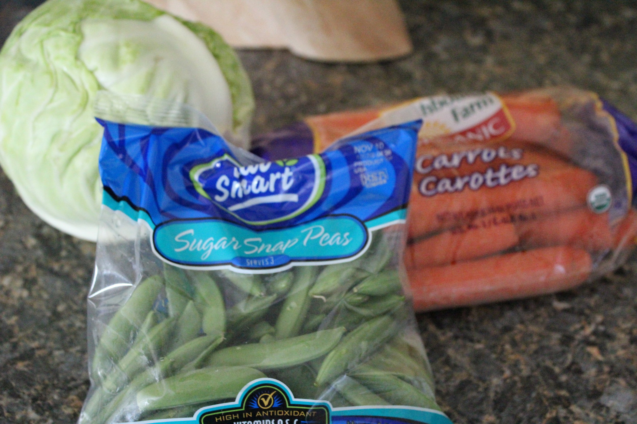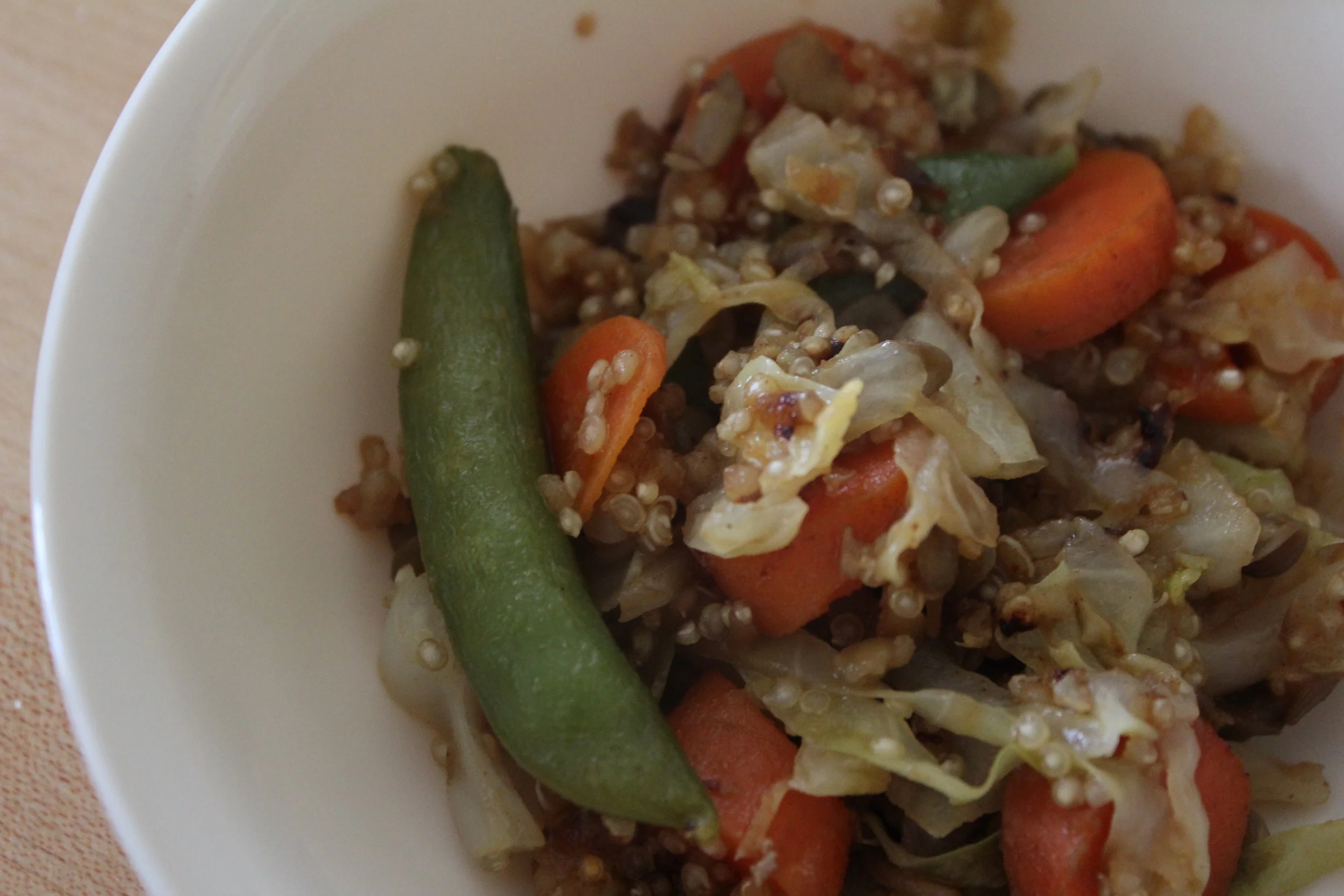 Drizzle two tablespoons olive oil into the largest skillet you have, over medium heat. Add carrots and cabbage and cook for 3-4 minutes. Add the pea pods, lentils, and garlic and stir; cook for another 1-2 mins. Next add quinoa and stock and cover with a lid. Turn stove to medium-low and cook for 10 mins.