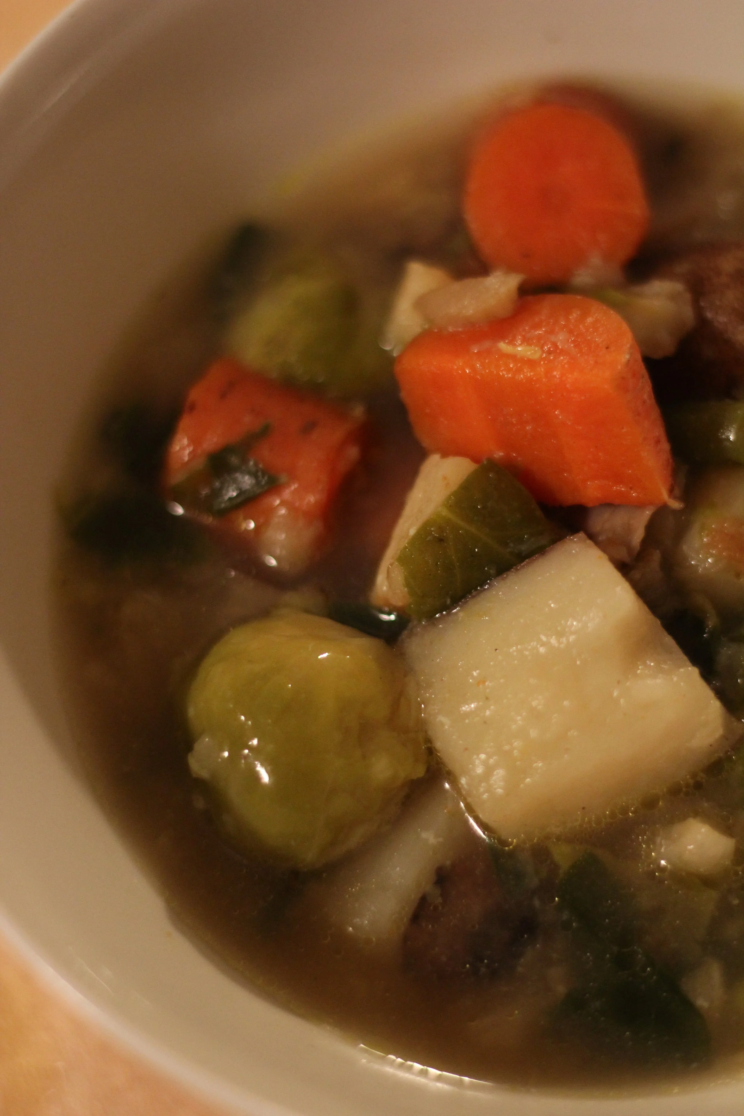 This soup was inspired by the sad and unused vegetables lurking in my fridge that were fringing ever-so-closely towards their expirey date. While the ingredients seem a little strange all hanging out together in the same stock pot, don't be weirded out until you try it. I am a huge brussel sprout fan but only when they are sauteed or roasted. I never considered them in a soup, until today!
