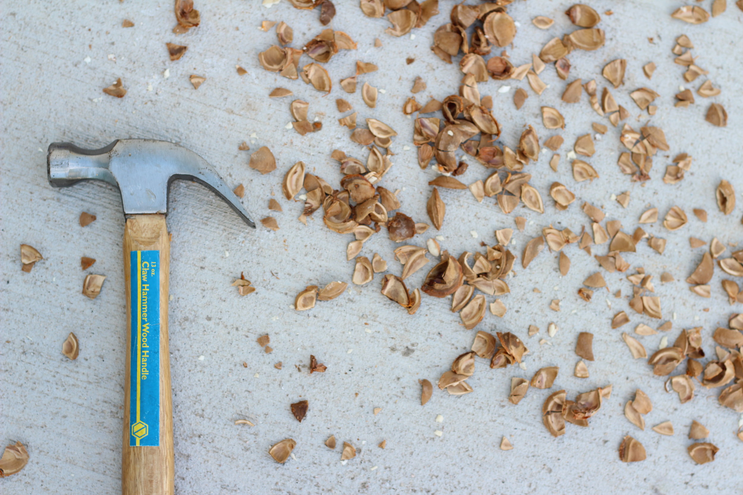 Using a towel and working outside, nestle the unsuspecting almond pits inside a folded towel. Using a hammer or rubber mallet, lightly begin tapping/hammering the towel to break up the pits. This is messy and pieces of the pits will go everywhere. Which is doing this outside or using a towel helps minimize a mess.