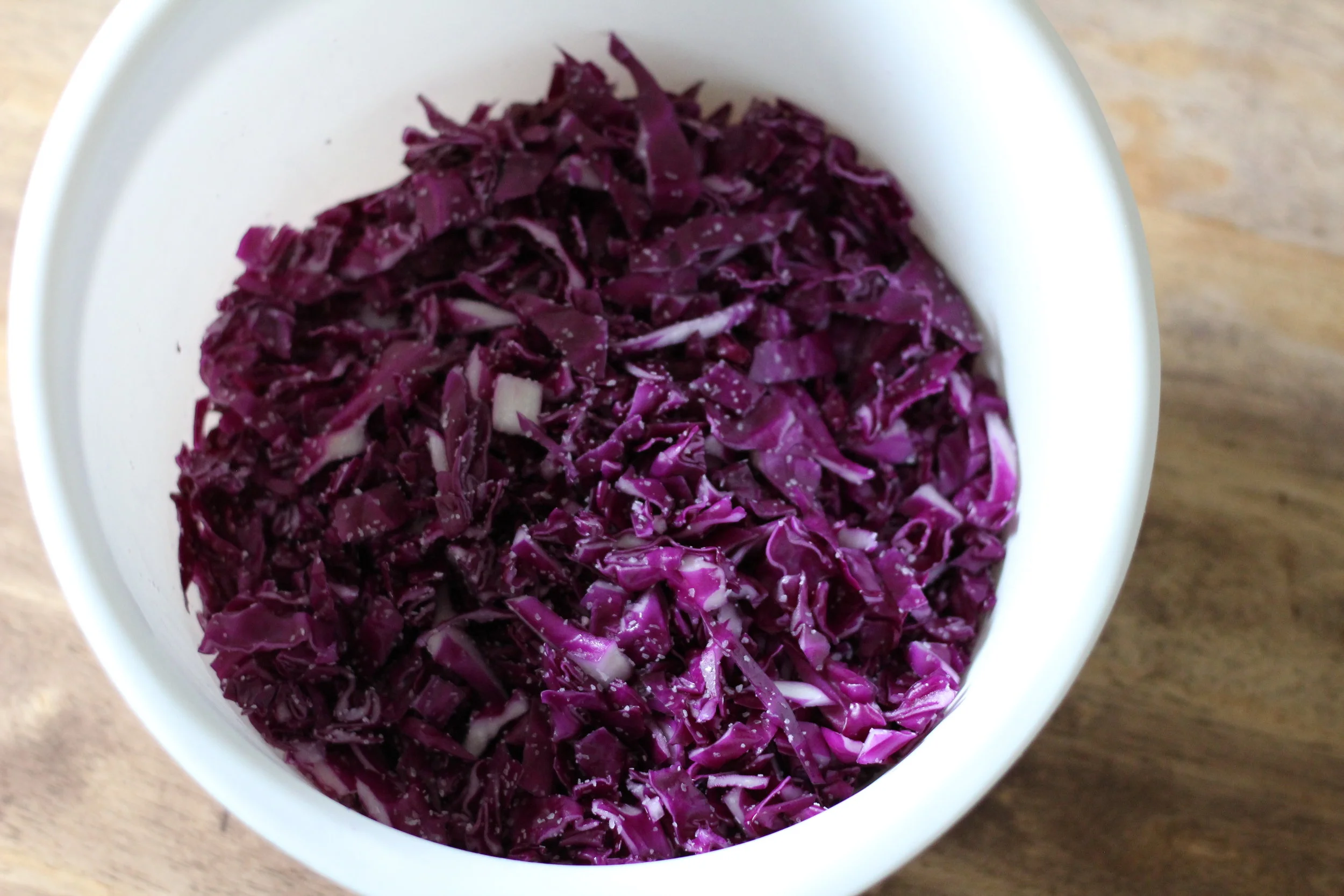 While working, be mindful of keeping the cabbage, your hands, and the workplace clean and free of other bacteria. After the cabbage has been sliced, place in a clean bowl and sprinkle 3-4 tablespoons of salt over it. Using clean hands, rub the salt thoroughly into the cabbage then place the cabbage into your glass jar. Fill the jar with clean water until it is just level with the cabbage.