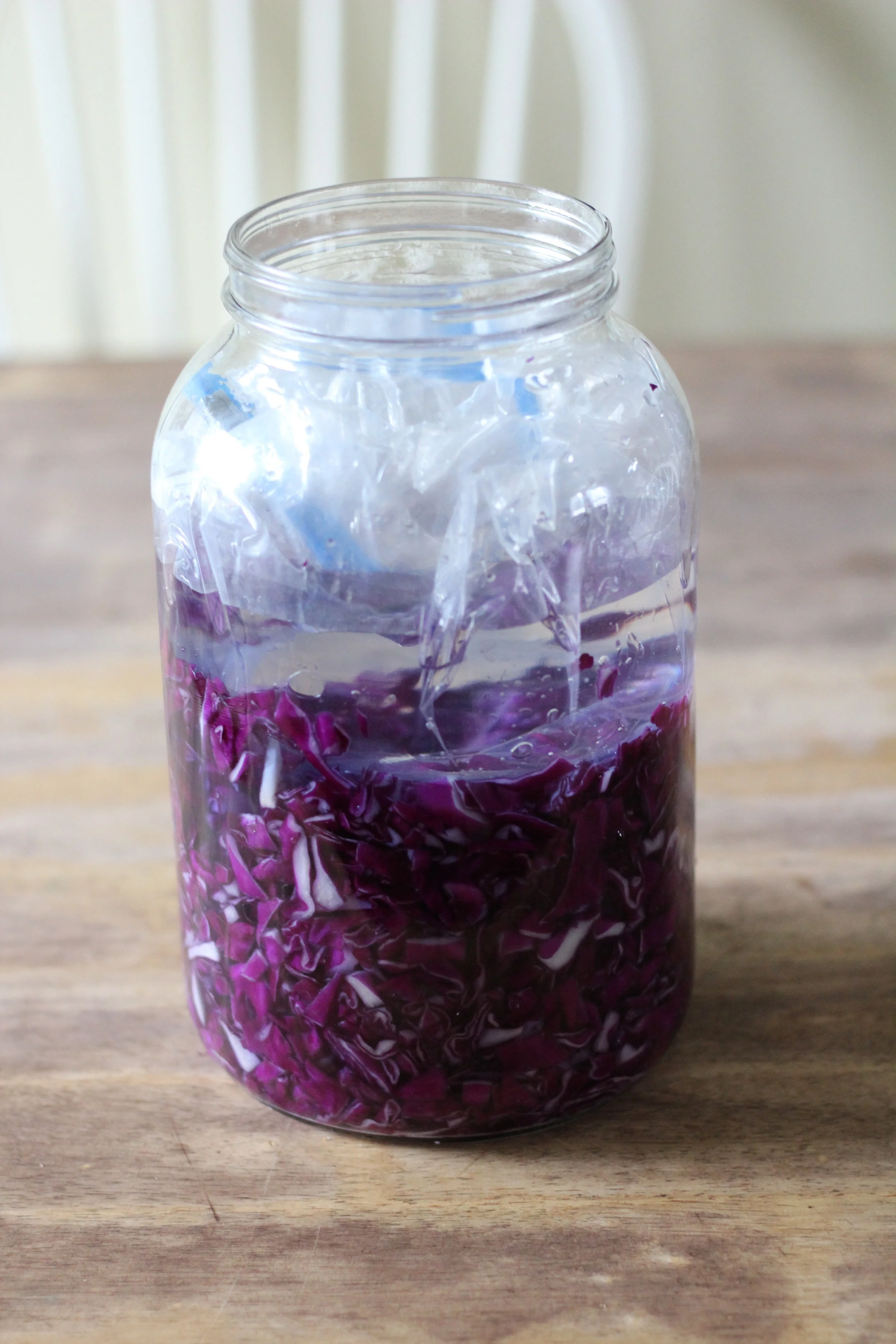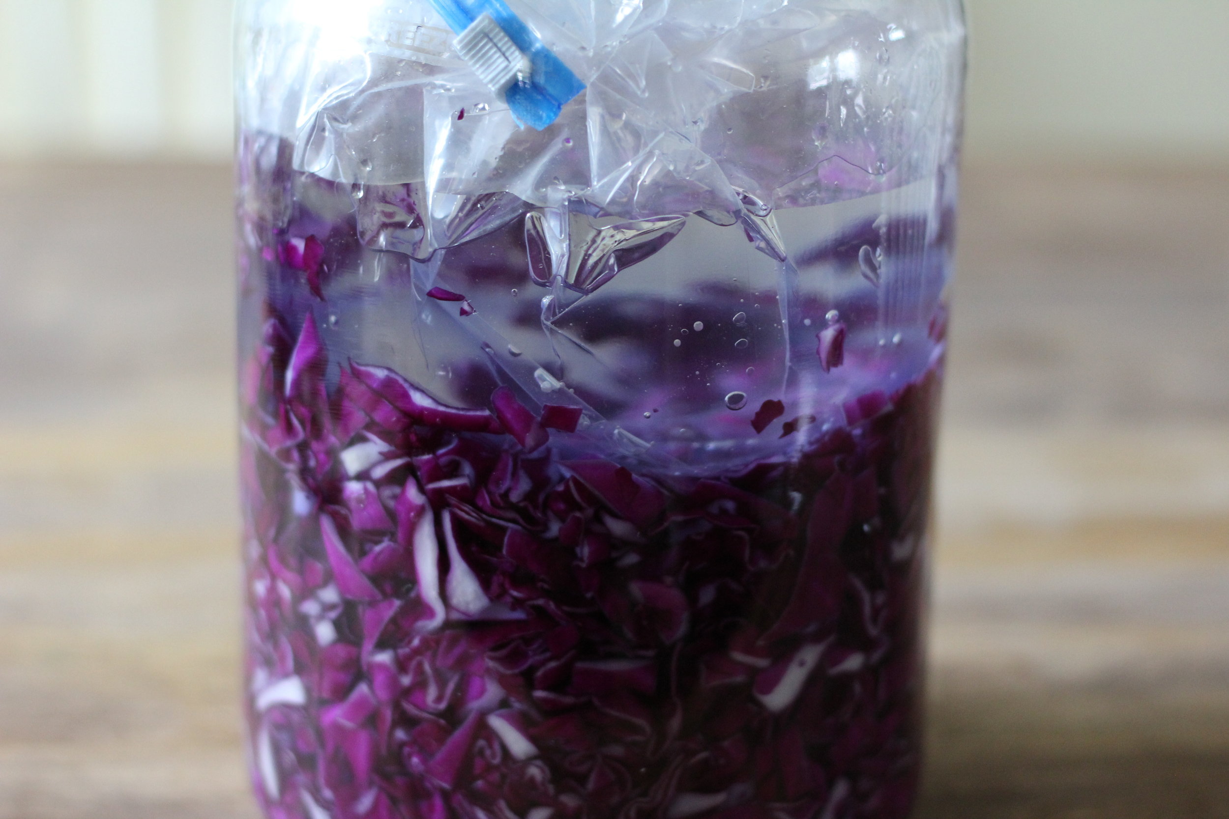 Pour water into a plastic bag and seal it. Push the bag into the jar so that it acts as a plug to seal off the sauerkraut and water from any air. This part is important, if its not sealed properly then air and bacteria can get into the sauerkraut which can ruin the sauerkraut.