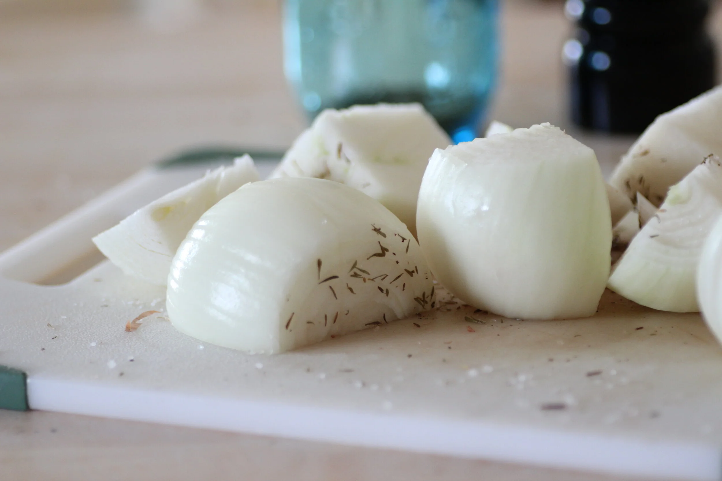 While the meat is searing, roughly chop up some onions and mince some fresh garlic.