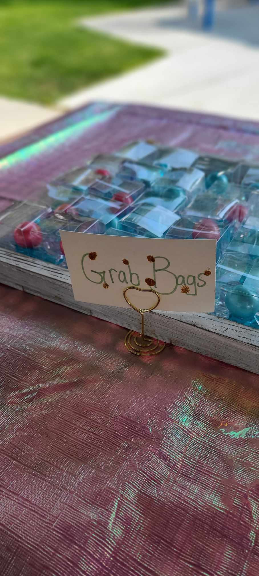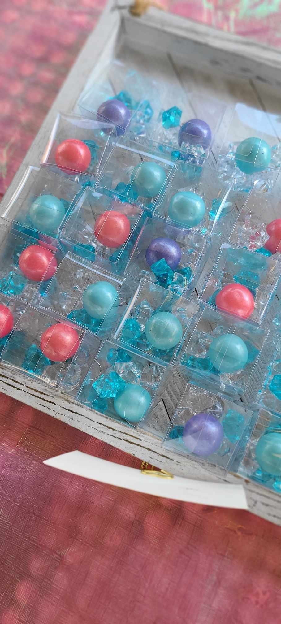 For the kid’s grab bags I kept it simple but they turned out quite elegant! I used tiny plastic truffle boxes and added in a small handful of crystal acrylic gems and giant pastel, shimmery gumballs. They loved them!